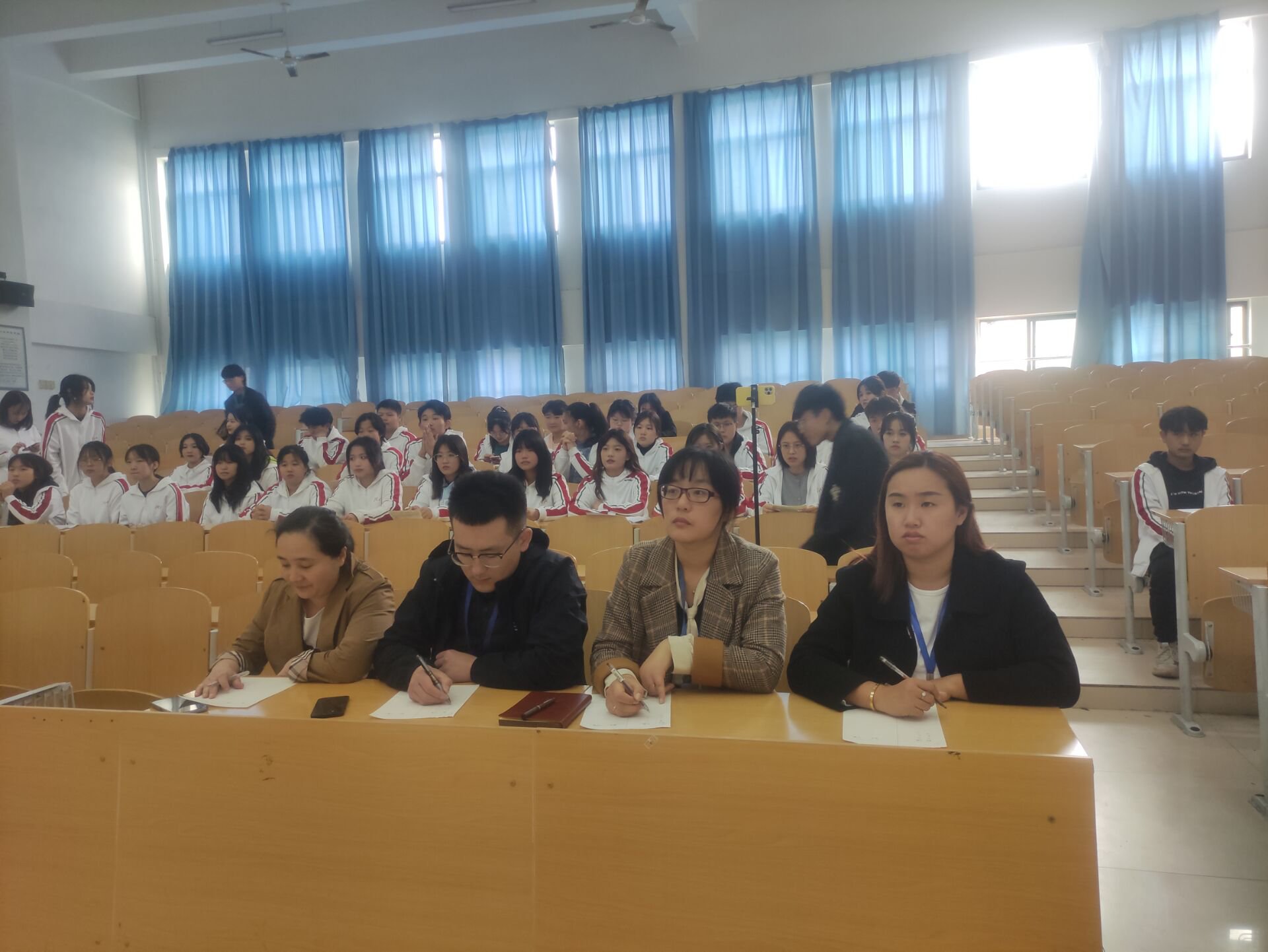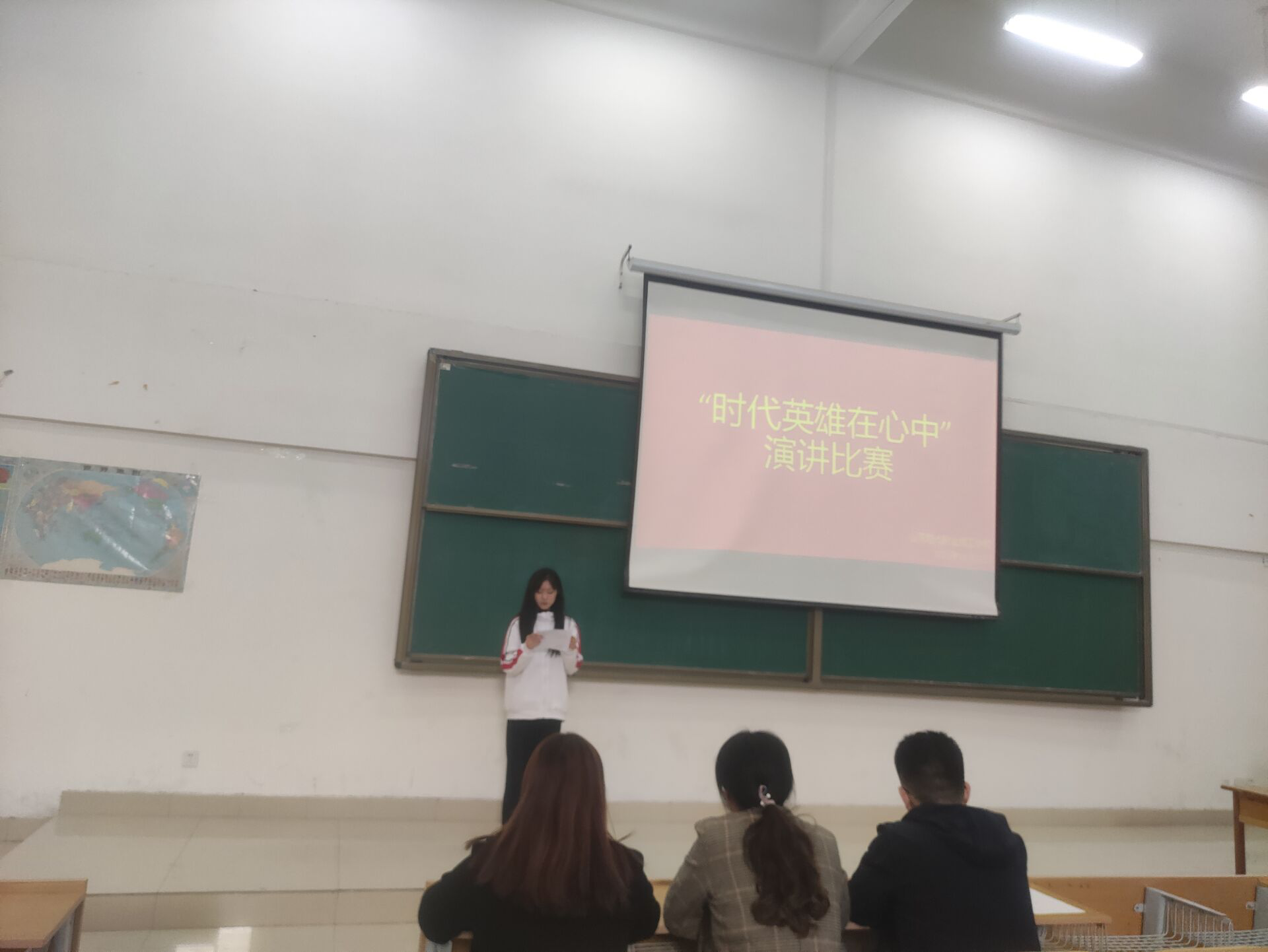 观摩演讲比赛的评委席老师有:学生处厉娟老师,幼教系刘玉凤老师,护理系赵美全老师,计算机系邹林君老师,各位老师与同学一起听着演讲,听着赞颂先烈的声音,心中也深有感触。